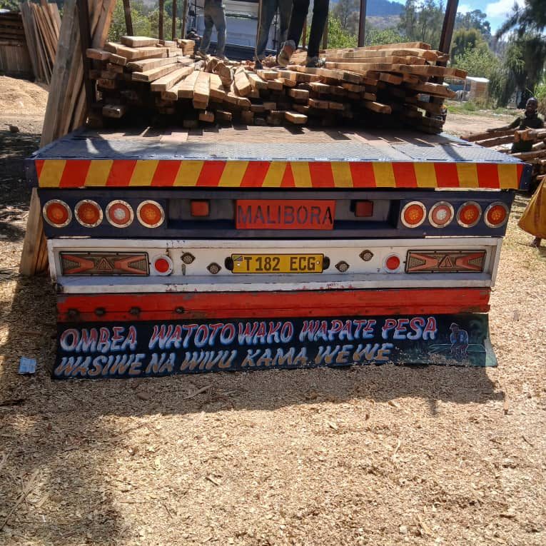 Image: Timber truck wisdom "Ombea watoto wako wapate pesa, wasiwe na wivu kama wewe"